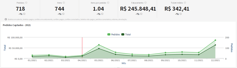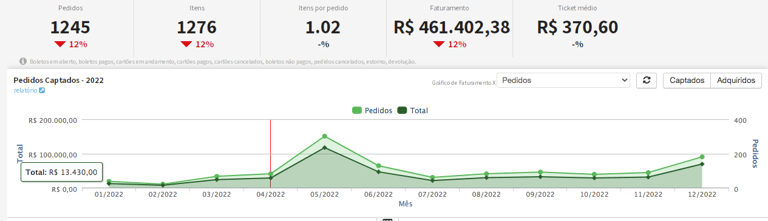 Aumento de 73% no número de pedidos e 87% no faturamento entre 2021 e 2022.